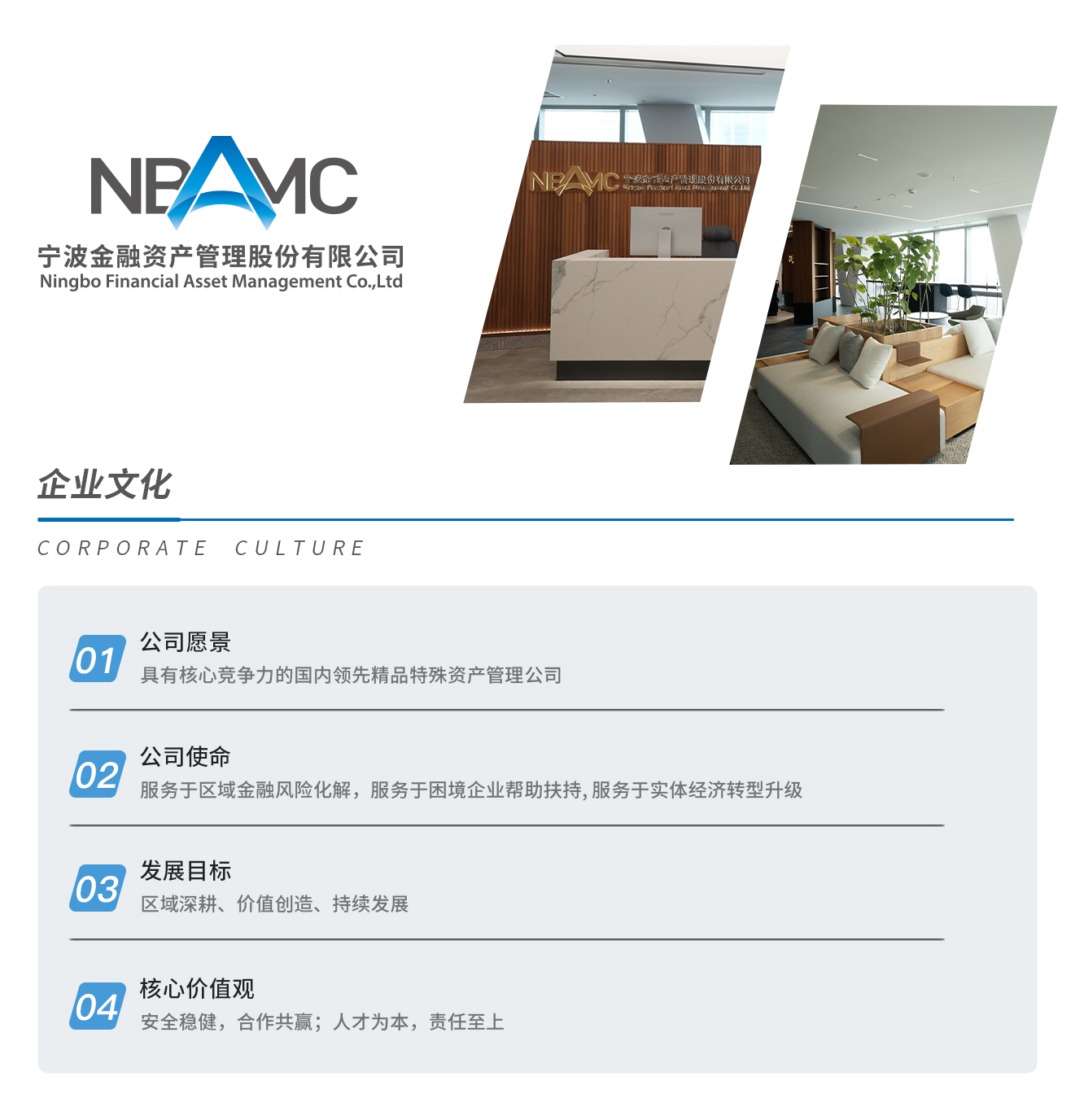 公司始終秉承依法合規(guī)、安全穩(wěn)健的經(jīng)營(yíng)理念,以“服務(wù)于區(qū)域金融風(fēng)險(xiǎn)化解、服務(wù)于困境企業(yè)幫助扶持、服務(wù)于實(shí)體經(jīng)濟(jì)轉(zhuǎn)型升級(jí)”為使命,深耕不良主業(yè),積極發(fā)展不良債權(quán)經(jīng)營(yíng)、特殊機(jī)遇投資等業(yè)務(wù),專注提升不良領(lǐng)域?qū)>?wù)能力,全力護(hù)航地方經(jīng)濟(jì)高質(zhì)量發(fā)展。經(jīng)營(yíng)版圖以寧波為中心,輻射長(zhǎng)三角、珠三角,在福州、南京、廣州等地設(shè)立辦事處。